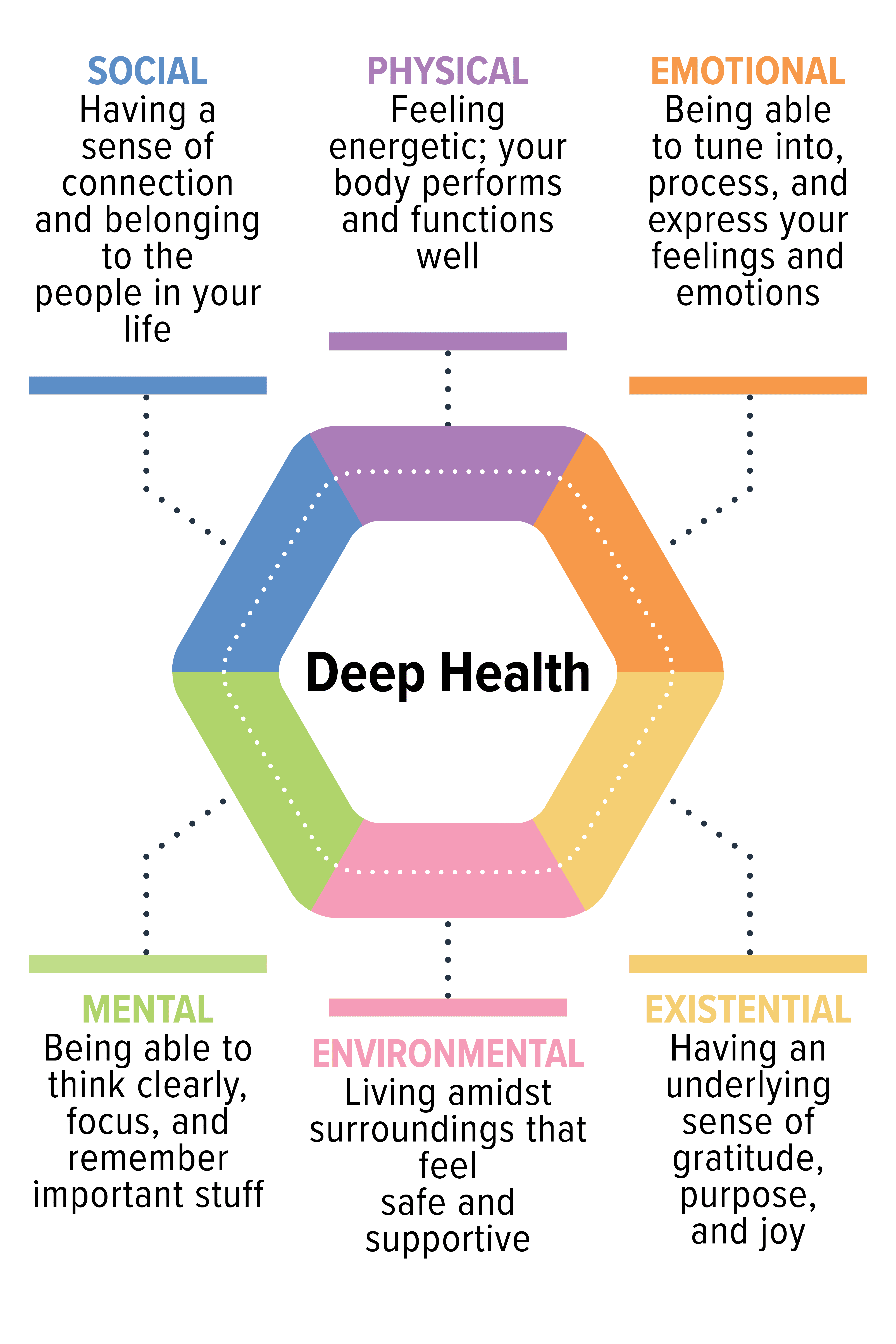 We refer to these areas as “dimensions of Deep Health,” and there are six of them: physical, emotional, mental, social, environmental, and existential.