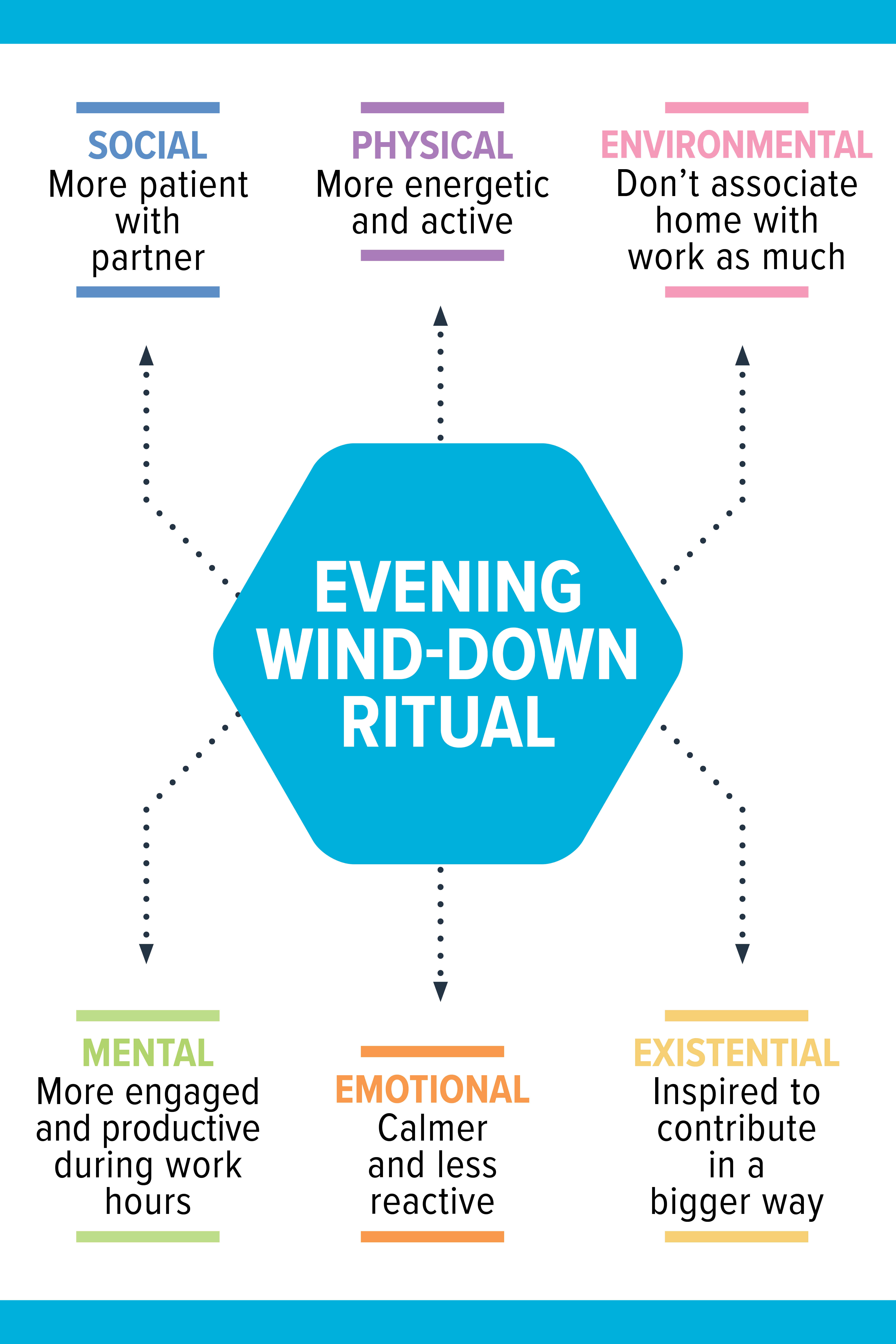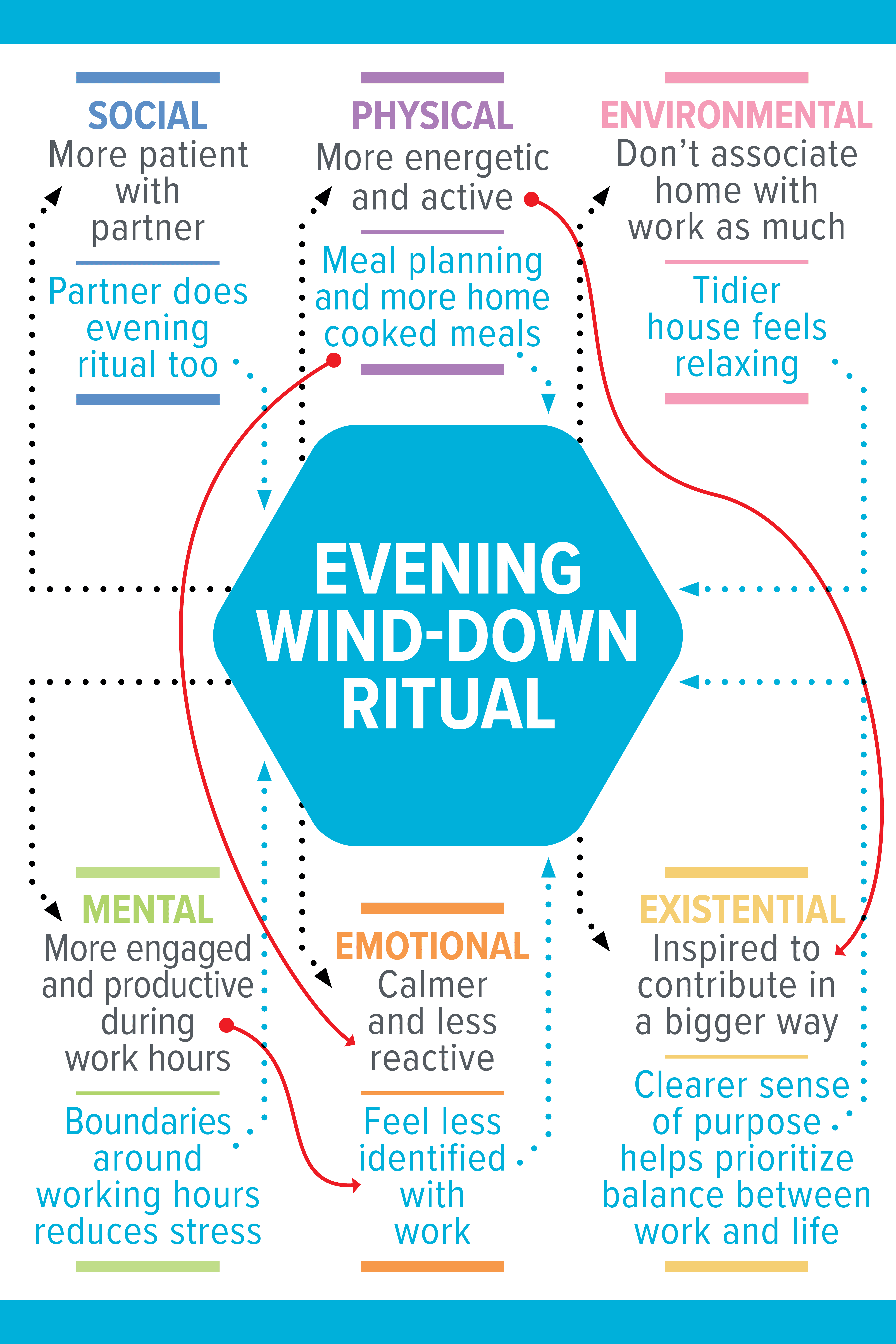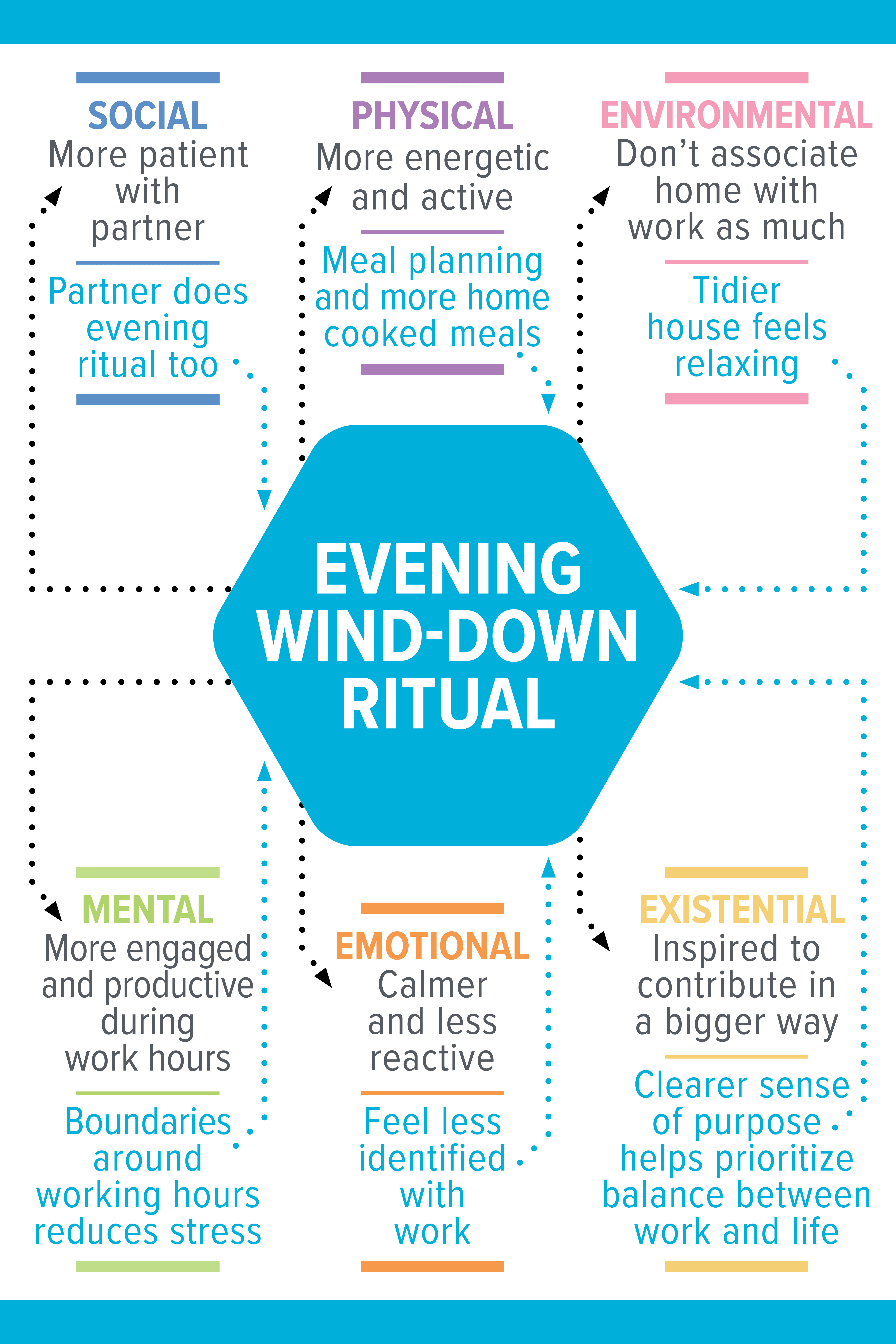 For example, not working evenings means you might spend more quality time with your spouse—bumping up social health—or even get a chance to do some light tidying up before bed—bumping up environmental health.